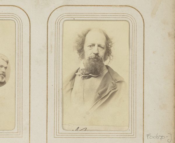 Curator: Today, we're looking at an albumen print titled "Portret van Gustave Aimard," created sometime between 1867 and 1875 by the studio of Lege & Bergeron. Editor: It’s undeniably evocative of a very specific era. I'm struck immediately by how textural the beard appears. The softness of the print contrasts oddly with that almost tangible roughness. Curator: Precisely! Photography, particularly the albumen process, was evolving rapidly. There's a romantic sensibility here, wouldn't you say? It's in his relaxed pose and direct gaze. He's holding what looks to be a pair of spectacles attached to some kind of rope, an object carrying both visual and functional weight. Editor: I wonder about the economic context. Albumen prints, despite their increasing accessibility, still represented a certain level of social status. The meticulous preparation, the egg whites…it's a whole laborious process rendered almost invisible in the final product. Was this a commission? A personal portrait for someone of means? Curator: The visual language suggests aspiration. He isn't simply being documented; there's a curated impression. He is subtly telegraphing an idea of intellect, linking it to the burgeoning literary world. Gustave Aimard was a writer of adventure novels, placing him directly into a popular narrative. Editor: Right, it’s also interesting how much of this image hinges on class presentation. That casual-yet-purposeful style gives a strong impression, one almost performed in its careful arrangement. There is an assertion through materials – a negotiation of identity built from textiles and adornment. Curator: And consider the psychological implication of image making at the time! This portrait immortalizes a romantic, historical figure and then disseminates that self-image. Editor: It all funnels into constructing a cultural narrative... The textures, the composition, the choice of material – it's a carefully constructed representation. Curator: A very particular arrangement of surface and symbol. This image becomes a historical touchstone through this method. Editor: Well, thinking about it through materiality has definitely reshaped my perspective, seeing that level of intentionality in even the most casual detail.