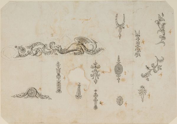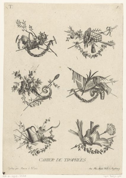 Johann Carl Schleich created this undated drawing, "Trofeeën met godenattributen en pijlenkokers" with pen and paper now held at the Rijksmuseum. The six distinct groupings present a study in contrasts and symmetries using curved lines to create organic, flowing shapes that evoke movement and rhythm, giving life to otherwise static objects. Schleich arranged symbols of love, war, and the arts, each ensemble thoughtfully balanced with a hint of asymmetry. These groupings form a structured framework that emphasizes the symbolic language of the trophies. Musical instruments, quivers of arrows, and flaming torches intersect with doves and garlands. Each juxtaposition opens a dialogue about the qualities and themes associated with these emblems. Consider how Schleich uses these well-known symbols to invite contemplation on the relationships between love, conflict, and creativity. They provide insight into the cultural values of his time.