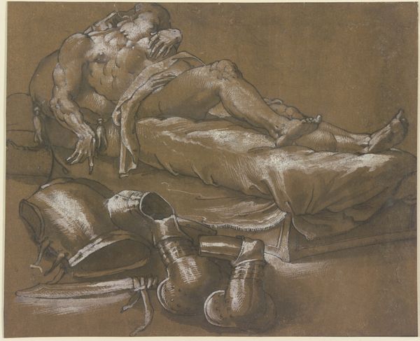 Editor: This drawing, "Danaë and the Golden Rain," is by Leonaert Bramer, from the 17th century, done in ink, gouache, and pencil on paper. It has an almost dreamlike quality to it...what visual metaphors do you see at play in this scene? Curator: Well, immediately, I’m drawn to the duality embedded within. We have Danaë, supine and open, receiving this 'golden rain'. In ancient mythology, this is Zeus transforming into gold to impregnate her. But it's not just about divine intervention; it speaks to the seductive power of wealth. Notice the ambiguous figure attending to her - what could be the intent or implication of their characterization? Editor: So, the golden rain isn't simply a blessing, but a symbol loaded with earthly and perhaps corrupting connotations? Curator: Precisely! Gold has always been a potent symbol: divinity, purity, but also greed, corruption. The image subtly conveys a sense of both the sacred and the profane coexisting. Does the scene bring to mind other depictions of mythological characters undergoing miraculous experiences, and if so, how do those experiences change the human condition? Editor: That's a very thought-provoking interpretation! It enriches my understanding by connecting mythology, wealth, and the human form. I never would have picked up on the complexity without your insight into symbolism. Curator: These visual symbols work through cultural memory. It is gratifying when art expands and enriches the world around us.
