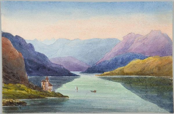 Curator: Theodore J. Richardson's watercolor, "Entrance to the Stikine River, Alaska," captures a serene vista. Editor: There’s a muted stillness to it, almost melancholic. The pale blues and grays evoke a sense of vast, untouched space. Curator: Notice the canoes; the artist employs them as symbols, vessels of passage, reflecting a connection to the land and Indigenous presence. Editor: Right. The Stikine River was a crucial trade route, so these boats also speak to colonial contact and the disruption of traditional ways of life. The romanticized landscape obscures the harsh realities. Curator: Perhaps. But, like many Hudson River School paintings, this offers a sense of transcendental beauty. The mountains could represent the sublime. Editor: Perhaps, but we should also acknowledge that claiming sublime beauty justified the erasure of Indigenous narratives. Curator: A vital point. Ultimately, the painting becomes more than just a landscape; it’s a reflection on cultural and environmental dynamics. Editor: Exactly. Richardson gives us a surface of beauty, but we have to question what lies beneath.
