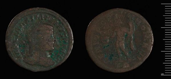 Editor: Here we have a dupondius of Antoninus Pius, at the Harvard Art Museums. It's quite small, and the surface is heavily patinated. What strikes you about the composition of this coin? Curator: The incised portraiture, though worn, remains a powerful formal element. Observe how the profile captures a sense of imperial authority through its line and form. The texture of the metal itself contributes to a dialogue between decay and enduring image. Editor: Do you think the corrosion detracts from the artist's original intent? Curator: It alters the surface, certainly, yet it also layers a temporal dimension onto the piece, highlighting its existence across centuries. It’s another texture for our consideration. Editor: That's a great point. I never thought about it that way. Curator: Examining the interplay of design and material transformation gives us a deeper understanding of the object itself.