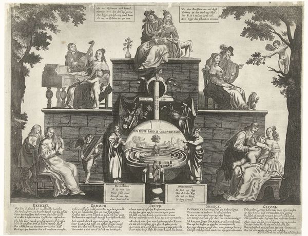 Pieter Nolpe made this print, "Trap des Levens", sometime in the 17th century, using etching and engraving. These are intaglio processes, meaning that lines are incised into a metal plate, and then filled with ink. The ink is then transferred to paper under great pressure, resulting in an image with remarkable detail. Look closely, and you'll see how Nolpe used this technique to full effect, to depict the stages of a woman's life as a series of steps. Note the sharp contrast between the dark, deeply etched lines and the lighter areas, which gives the print a striking visual impact. The print medium itself speaks to the rise of the printing press as a force of mass communication, and the increasing availability of images to a wider audience. Consider the labor involved in creating such a detailed work, from the initial drawing to the painstaking process of etching and printing. This reminds us that even seemingly simple images are the result of skilled craftsmanship and careful production, and are deeply embedded in their own time. This print is not just an image, but an object that carries with it the traces of its own making.