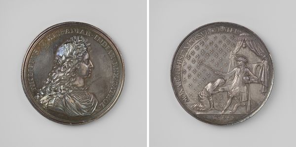 Editor: This metal relief from 1843 by Johannes Petrus Schouberg is titled "Overlijden van Willem I Frederik, gedurende vijfentwintig jaar koning der Nederlanden," or, "Death of William I Frederick, for twenty-five years King of the Netherlands." I'm struck by the neoclassical imagery—a somber profile on one side and what seems like a personification of grief on the other. What do you see in this piece? Curator: Beyond the surface level of neoclassical aesthetics and its commemorative purpose, it’s critical to ask, "Whose narrative is being privileged here?" The medal not only memorializes the King but also solidifies the power structure of the monarchy within Dutch society. We should question the deliberate use of idealized imagery and classical motifs. What effect does this idealized representation have on how the public perceived the King? Editor: I guess it makes him seem timeless, almost godlike? And it creates a very specific idea of mourning... Curator: Exactly. Consider how this imagery might have served to quell dissent or promote national unity by manufacturing consent to those in power. What ideologies are embedded within its visual language, particularly concerning power, legacy, and the ideal citizen? We must deconstruct these elements to understand their impact. What stories are actively suppressed to celebrate the monarchy and paint the king in an extremely favorable way? Editor: So it’s less about the King himself and more about how his image served a larger political purpose? Curator: Precisely. It prompts a broader discussion about power dynamics and the role of art in shaping collective memory, demanding an intersectional approach to examine these artworks to unpack those dominant discourses. Editor: I hadn't thought of it that way at all. It’s amazing to think about all of these undercurrents in what seems like just a memorial. Curator: By unveiling those narratives, we empower ourselves to engage more critically with history.