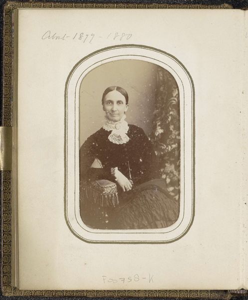 Curator: Up next we have a captivating portrait, "Portret van een vrouw met een halssieraad en opgestoken haar", or "Portrait of a Woman with Necklace and Hair Up", crafted between 1862 and 1873 by Wilhelm J. Grammann. It's an exquisite example of 19th-century photography. Editor: There’s an immediate solemnity to this image, isn't there? The stark lighting and her direct gaze create such an intimate, almost haunting atmosphere. The symmetry of the composition draws the eye directly to her face. Curator: The power of such early photography. What I see is the symbolic weight she carries. Her tightly bound hair and simple adornments speak of restraint and perhaps a specific cultural expectation of womanhood at that time. There’s a certain archetype represented here, of the grounded matriarch. Editor: Precisely. It's not just about restraint. Note the tonality, the narrow depth of field – it pushes her forward, sets her apart in this very shallow space, almost like a classical bust sculpture. It emphasizes presence despite the lack of overt color or vibrancy. Curator: And even in the simplicity, the jewelry offers a small glimmer of individuality, doesn't it? A break in the otherwise reserved presentation. Those adornments also function as silent symbols, communicating social standing, perhaps religious affiliation, certainly marking womanhood and its prescribed stages. Editor: Right, it's about accentuating specific focal points: her face and neck. It guides the eye to her expression, attempting to decipher it. What strikes me most is that calculated balance between revealing and concealing achieved through masterful use of lighting. Curator: Absolutely, a fascinating dance of societal roles and individual spirit, isn't it? She embodies an entire era in that gaze, in her posture. We can project our cultural memories onto her. Editor: True. Thinking about Grammann’s artistic choices – I see now how the subdued palette encourages a deeper look at texture and form. The portrait resonates beyond its subject to become an examination of the photographic medium itself. Curator: It offers a way to understand inherited customs. These symbolic echoes remain powerful, shaping our interpretation and relation to past generations and cultural ideologies. Editor: I agree. Its austerity unlocks complex meaning hidden within what at first seems like a simple likeness. Curator: An era speaking to us in tones and light, quite beautifully. Editor: A very evocative composition, offering endless avenues for interpretation, wouldn't you say?
