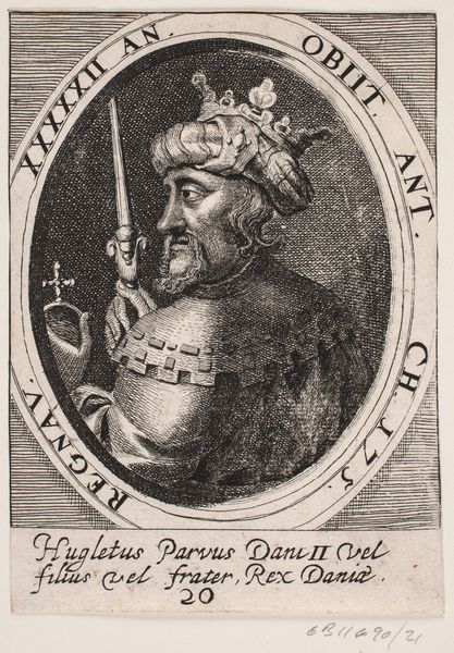 Curator: Today, we're looking at "Portret van Kara Mustafa Pasha," an engraving made by Jacob Gole sometime between 1670 and 1724. The print is currently held here at the Rijksmuseum. What’s your first impression? Editor: Ominous. Definitely gives off a “Don't mess with me” vibe. The guy is holding a sword and wearing what looks like an enormous bird on his head. Intimidating, dramatic, a bit baroque in its intensity, like a visual thunderclap. Curator: Absolutely. Gole's mastery of line and contrast shapes the reading. Note the careful balance between detail and abstraction, guiding the eye to key details—the subject's stern gaze, the ornate details on his turban and robe, all framed by that swirling, serpentine border. Editor: That border! I’m getting anxiety just looking at it! The frame, the text—it's all crammed together. There is a ton of symbolic information in the lower quarter. Almost like a heraldic shield gone wild. He wasn’t a subtle fellow, was he? Curator: Not particularly. The engraving highlights his power through visual rhetoric, presenting Kara Mustafa Pasha as a figure of authority and, given his historical role, perhaps also of ill omen. His failures in Vienna led to his execution—reflected, perhaps, in the stark blacks and whites. Editor: It’s the way Gole captured the textures that's impressive. The softness of the fur trim against the glint of the metal—it almost tricks you into thinking you're looking at layers, even though it's all line work. It's that contrast, isn't it, between the opulent textures and his harsh fate? The impermanence of power beautifully rendered. Curator: Indeed. It’s a fascinating piece, emblematic of the era’s fascination with portraiture and the use of printmaking to disseminate powerful imagery. It's also a clear demonstration of the artist’s formal skills, skillfully controlling visual tone. Editor: You know, staring at it longer, I think there’s a sad grandeur to it, too. Despite the evident status and menace, one can sense a kind of weight in his expression –the burden of leadership or perhaps a premonition? Something almost tragic. Curator: An astute observation. It's in those complexities that the true power of this engraving lies. Thanks for pointing that out.