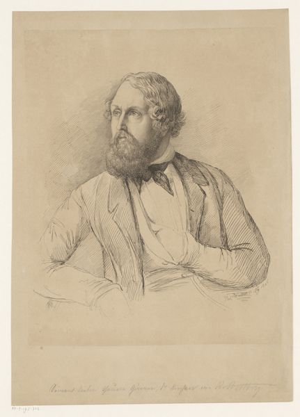 Curator: We're standing before Friedrich von Amerling's "Portrait of Władysław Branicki," completed in 1852. What's your first impression? Editor: Dark, rather somber, I think. The palette is quite restrained and there is visible craquelure, which I find both appealing and also somewhat melancholic. The gentleman certainly looks dignified, although he's caught in a profile which adds to that effect. Curator: The portrait offers insights into the aristocratic circles of the time and is evocative of Romantic and Realist trends in painting. We have this striking composition, created with oil paints, that captures Branicki in a somewhat contemplative mood. It speaks of the social elite and the way portraiture served to solidify and project status. Editor: And one could even say, cement power. The level of detail suggests considerable skill and patronage, I mean, the brushwork is impressive. Considering the date, I wonder how this commission was funded, who controlled its messaging, and to what extent the artistic process reflects that socioeconomic framework? Curator: The painting technique suggests a craftsman working within specific societal norms, providing his service for those who had political clout. But let's consider the setting—the use of light to sculpt the features, and the subtle handling of texture in the beard and hair—that requires refined skill. Were there apprentices involved in its production, how many layers of gesso where used? Editor: True, and understanding the artist's access to resources, to paints themselves, gives context to the whole piece. It brings the materiality of wealth to the surface when you begin to think of how such commissions also provided the very livelihood and reputation of its makers. But let’s not forget the cultural significance. Portraiture often operated as a visual archive, a form of political propaganda even. How was Branicki's identity presented to the world? Curator: It makes me wonder about his lineage, how the portrait served within the network of powerful families of the time. I agree; art has often played a crucial role in upholding established hierarchies. Editor: This work of art certainly gives a sense of those power dynamics. I appreciate the somber notes you have helped me unpack here and I think its an enduring witness of the artistic production of the epoch. Curator: Agreed, by understanding the materials used and the historical context that generated the portrait, we see both the subject and how artwork has long played a public role for private individuals.