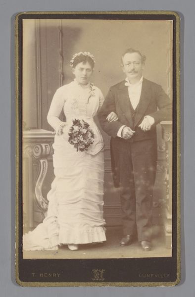 Editor: This is a gelatin silver print entitled "Portret van een bruidspaar in bruidskleding" - or Portrait of a Bridal Couple in Wedding Clothes - created by Guillame Maximilien Zimmermann between 1897 and 1902. There’s a certain solemnity to the photograph; the couple looks so formal, so proper. How do you interpret this work, considering its historical context? Curator: Well, consider the era. Photography like this was often a significant investment, solidifying social conventions. It wasn’t just a snapshot; it was a curated representation of status and aspirations. Do you notice the backdrop, the clothing? How might those details be communicating messages about the couple? Editor: I see what you mean. The elaborate dress and the formal suit definitely suggest a certain social standing. The backdrop, while simple, looks like it's in a studio rather than their home. So it's very staged. Does this kind of posed photograph reinforce or challenge societal expectations around marriage at the time? Curator: It largely reinforces them, but with subtle complexities. It memorializes an ideal – a picture of marital union rooted in societal expectation, yes, but also potentially masking the lived realities of the people within that expectation. Consider what wasn't shown: the complexities of courtship, familial pressures, the economic realities that shape marriage. It’s this tension between the presented image and the unrepresented truths that offers insight. Editor: So it’s both a celebration and, in a way, an encapsulation of societal pressures? That's a perspective I hadn’t considered. Curator: Exactly. Examining the image this way opens discussions about gender roles, economic structures, and the performance of identity in the late 19th century. We start to question who this marriage served, and how. Editor: That's fascinating. Looking at the image now, I see a lot more than just a wedding portrait. Thank you for offering this new viewpoint.