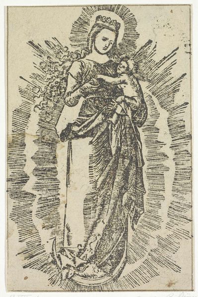 David-Pierre Giottino Humbert de Superville created this print titled 'Vrouw in stralenkrans' sometime between 1770 and 1849. Here we see a female figure surrounded by rays of light, her hands clasped over what appears to be a pregnant belly. Prints like this one existed within a specific art market. They were cheaper to produce and buy than paintings, and so offered a means of circulating images to a wider public. In Revolutionary France, where Superville began his career, art became newly entwined with politics. Artists were encouraged to produce works that promoted republican values. We might ask, then, is there something about the figure's serene pose and the radiating light that aligns with the revolutionary ideals of enlightenment, reason and progress? To understand this artwork fully, we could research the artist’s biography, the print market in the 18th and 19th centuries, and the impact of the French Revolution on the art world.