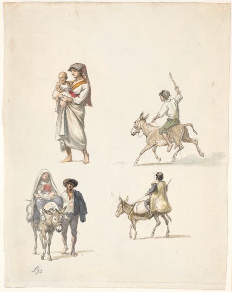Editor: Here we have “Sketches of Peasants in Boulogne” by Frederick Christian Lewis, created around 1868. It’s a drawing done with graphite, ink and colored pencil on paper, currently at the Art Institute of Chicago. I’m immediately struck by how each figure seems caught in a candid moment, a small slice of their daily lives, almost like individual icons of labor. What symbols do you find most compelling? Curator: The repetition itself becomes a potent symbol, doesn't it? Consider the baskets: Each represents sustenance, toil, connection to the land. Look closer— what do their slight variations suggest about the individuals carrying them? Is that wear and tear? Staining? These details begin to unveil personal narratives woven into the broader cultural narrative of rural life in Boulogne. Editor: That's interesting. I hadn't thought about reading the baskets as individual markers. Are there other repeating visual motifs here? Curator: Observe the head coverings. Some are simple scarves, others elaborate caps. What do these choices signal? Perhaps status within the community, adherence to tradition, or even individual self-expression within a prescribed social framework. Lewis isn't simply rendering peasants; he is subtly encoding a complex visual language. Editor: So, it’s not just a quick sketch but a deliberate construction of meaning through these repeated, yet distinct, images? Curator: Precisely. Think about how collective memory functions: fragments, repetitions, slight variations building shared understanding. Lewis captures that perfectly. He shows us the individual *and* their role within a larger, shared experience of labor and place. Do you see how those hats almost form their own symbolic syntax across the image? Editor: Yes, now that you point it out, it’s less a collection of random drawings and more like a visual lexicon of Boulogne peasantry. It really makes you consider the weight and purpose behind each detail, each sketch. Curator: Absolutely, and it illustrates how seemingly simple imagery carries cultural memory.