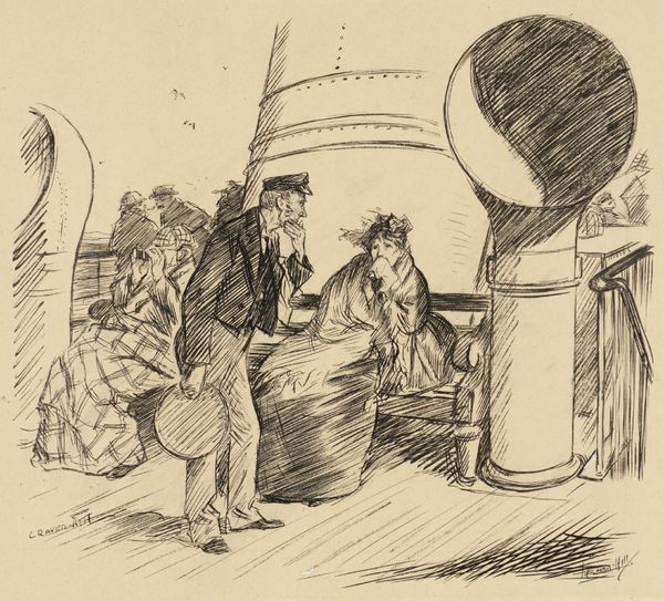 Curator: Here we have Hans Borrebach’s “Jongen stuit op een man in een gewelfde ruimte,” a drawing rendered in ink on paper, created before 1945. Editor: That’s quite a title! It’s so descriptive. I find the contrast between the sketchy lines and stark black areas really striking, it gives the whole piece an air of mystery. What do you see in this piece? Curator: The formal tension, primarily. Notice the interplay between geometric and organic forms—the arches versus the figures. Observe the artist's careful control of line weight, varying from delicate outlines to dense areas of shadow, especially how the use of hatching and cross-hatching creates a sense of depth, even in a primarily two-dimensional work. It creates visual interest and directs the eye. How does that strike you? Editor: I see that, it's like the artist is controlling what we focus on. The textures almost tell a story. I notice the figures’ forms are quite simple. Curator: Precisely. Now consider how the composition leads the eye from the brighter figure on the left, moving towards the darker figure seated further back, reinforcing that sense of narrative tension within a constructed pictorial space. The contrast enhances this, no? The eye travels into the darks of the shadowed area. Editor: I agree, I didn't realize how much the composition affects my reading of the scene! It's cleverly structured. Curator: Indeed. Through his precise articulation of form and spatial relationships, Borrebach invites us into a compelling formal dialogue, far more potent than mere representational imagery. It is these very elements which sustain artistic scrutiny, wouldn’t you agree? Editor: Absolutely! I've learned to appreciate how the elements contribute to an artwork’s structure. Curator: That's wonderful, and what a fascinating journey it’s been into the very anatomy of the piece!