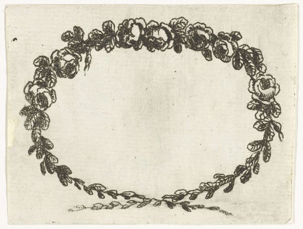 Lodewijk Joseph Fruytiers created this rocaille frame most likely in the mid-18th century, using etching techniques. The composition presents an oval form, richly adorned with organic motifs. The continuous, undulating lines create a sense of movement, drawing the eye along the frame's perimeter. Fruytiers masterfully employs the rococo style, where asymmetry and decorative elements converge to evoke dynamism and playful elegance. The frame's structure destabilizes the conventional understanding of borders, by using a semiotic system of flora and fauna. Note the intentional asymmetry in the arrangement of leaves and fruits, a hallmark of rococo. These elements, rendered with detailed precision, contribute to the frame's elaborate texture, inviting tactile as well as visual exploration. It functions not merely as a border, but as a statement on nature, artifice, and the playful disruption of formal boundaries.