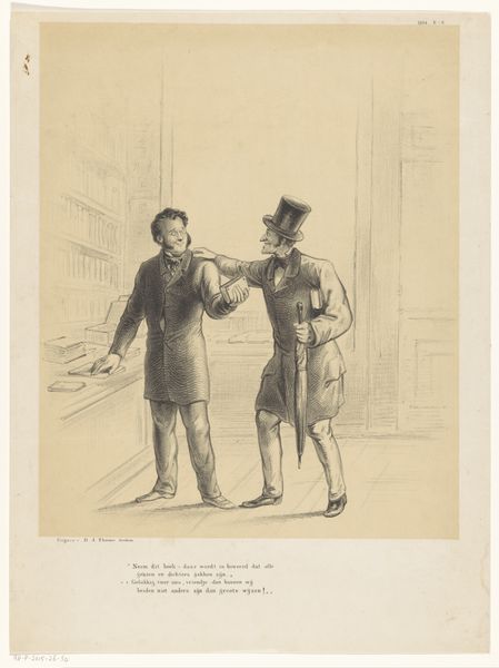Curator: Let's delve into this lithograph from 1870, titled "Spotprent over de geruchten van annexatie van België en Luxemburg door Frankrijk en Duitsland," which translates to "Cartoon about the rumors of annexation of Belgium and Luxembourg by France and Germany". It is a drawing by Johan Michaël Schmidt Crans. My initial thought is how darkly humorous and charged it is with a very specific historical anxiety. Editor: Indeed. Looking at the composition, I’m immediately drawn to the etching quality. The stark contrast and dense crosshatching speak volumes about the urgency of its production, the materiality underscoring a rapid response to political rumblings. It looks inexpensive to make, almost like propaganda. Curator: Precisely! Observe how the artist employs caricature. We see two figures, presumably representing France and Germany, each clutching what seems to be the keys or deeds to neighboring countries. Keys…deeds…emblems of authority, rendered in ink, laden with symbolic weight, suggesting a potential symbolic imprisonment. Editor: Right. Paper, ink, and the lithographic process allowed for quick dissemination. The physical artifact embodies anxieties about labor and the shift in national identity prompted by economic pressures and political shifts in that period. Were these cartoons mass-produced to sway public opinion perhaps? Curator: Undoubtedly. The style, rooted in realism, conveys the tangible fears of the time. Consider the positioning of the figures in front of a building labeled "Luxembourg" with the door open; and "Leopold", name of the king, on the left. All signifiers of what's at risk. And there is also a small, dim moon. All together create an atmosphere that hints to impending danger and covert action. Editor: The very lines that form these characters betray that danger. And their clothing is common! These are not aristocratic figures; instead they resemble commoners, workingmen, enacting a land grab as if it is just business as usual. How ordinary it all feels. It really implicates a broader societal consent in their power play. Curator: An excellent point. This drawing, while small, opens a vast window onto the socio-political dynamics of the 19th century, revealing the visual strategies employed to capture collective sentiment and manipulate political discourse. The power of art… Editor: And its accessibility. Through cheap materials and quick reproduction, its impact on society deepens and spreads much further. The very existence of this print raises urgent questions about how objects like these mold, reflect, and influence history's tumultuous path.