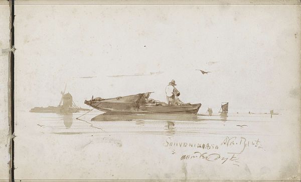 Curator: Here we have “River with Figures in Rowing Boats,” a watercolor and pencil sketch by Johannes Tavenraat, created sometime between 1864 and 1880. It is now part of the Rijksmuseum’s collection. Editor: My initial impression is one of quiet labor and routine. The monochromatic wash gives it a subdued, almost melancholic feel. You can almost feel the weight of the oars and hear the water lapping. Curator: Interesting. I see that melancholic mood as a reflection of the social conditions in the Netherlands during that period. There were considerable tensions due to industrialization and shifting class structures; an everyday scene like this offers a subtle commentary. Editor: I agree the limited palette is striking. But I see the way Tavenraat handles the watercolor, the fluidity, how he lets the material itself almost guide the image as evidence of process. It really blurs any hierarchy between, say, academic painting and more craft-oriented forms of image making. Curator: True. However, we should also remember the function of sketches like these in academic training at the time. Tavenraat may have been developing his skills within a clear set of established conventions for landscape art, even if the sketch itself feels spontaneous. Editor: Possibly, but think about the labor involved. Preparing the paper, mixing the pigments, the physical act of rowing recreated in short flicks of diluted ink; the entire process transforms mundane labor into aesthetic practice. It elevates that labor in a society that tends to hide labor in manufacturing. Curator: A valid point, certainly. Considering Tavenraat’s other works and the cultural context in which they were made, the social function of such images played an integral role. This particular watercolor reminds viewers about the rural life disrupted due to economic inequality. Editor: In any case, I appreciate seeing a work like this up close. It really encourages a reevaluation of how art is valued in our society, as more than a status symbol, but an record of how things are manufactured, felt, and created in certain ways. Curator: Indeed. Looking at “River with Figures in Rowing Boats” through different lenses gives a much richer appreciation of both the artist’s intention and its complex ties to societal narratives.