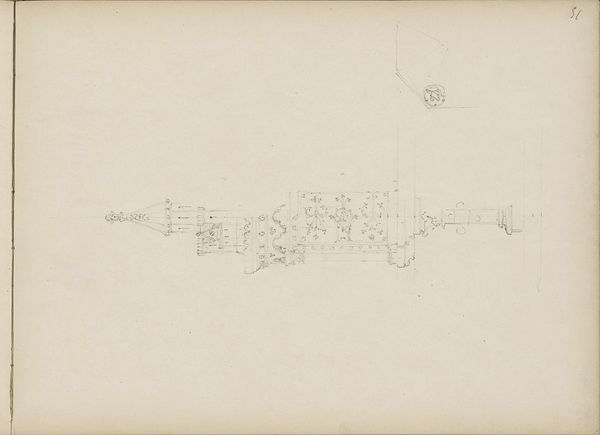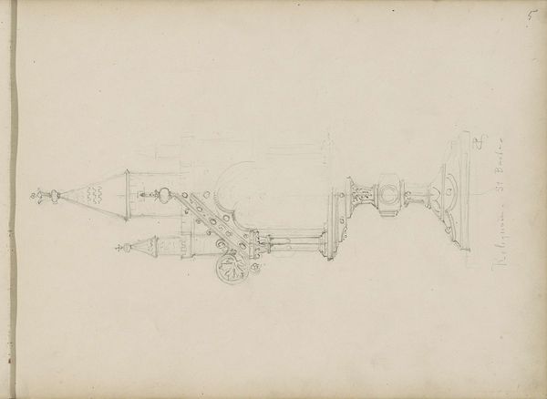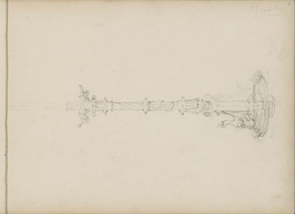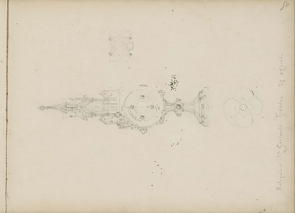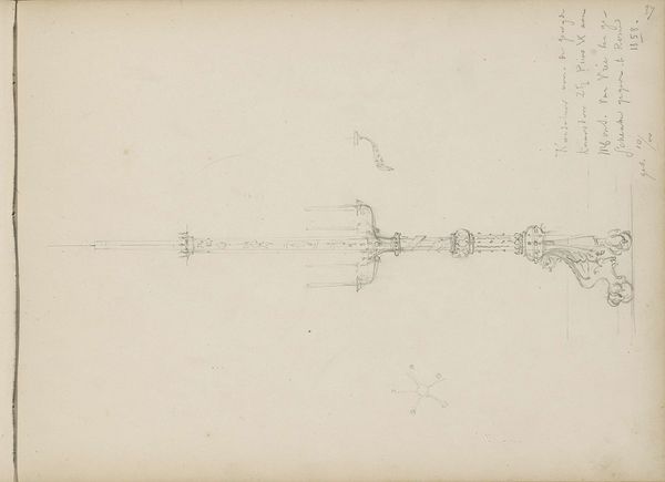 Editor: Here we have Pierre Joseph Hubert Cuypers' "Statiekruis", a pencil drawing from around 1857-1859. It looks like a study for a ceremonial cross. The delicate lines give it an almost ethereal quality. What stands out to you? Curator: Well, firstly, consider the cross itself. It is laden with Christian symbols, but they are also cultural symbols. The fleur-de-lis, for instance, frequently used, historically evokes French royalty but even before, lilies symbolised purity and resurrection. Cuypers is speaking a very deliberate visual language here, one instantly readable to his contemporary audience, imbuing the object with layers of meaning, even political, even spiritual. Editor: So, it's more than just a pretty design? Curator: Precisely. The visual language carries centuries of weight. Think about the geometric forms themselves - circles, the intersection of lines... these echo the Medieval fascination with divine order and the inherent beauty found within mathematical structures. Why do you think he looked back to Medieval forms? Editor: Maybe he was interested in recreating a sense of religious devotion or tradition. It almost feels like he was trying to design something that felt both old and new. Curator: A revival, indeed. The medieval period in Northern Europe evokes, to many, an intense period of Catholic devotion. Cuypers’ design uses the visual vernacular of a romanticised, somewhat imagined Middle Ages to reconnect the viewer with deeply rooted emotional responses, creating a bridge between the past and the present. Notice the directionality and symmetry: a sort of axial harmony is achieved. Editor: That makes so much sense. I didn't realize how much symbolism could be packed into a single drawing. I’ll be thinking about cultural memory a lot more when looking at art. Curator: And I hope to think about visual harmony much more intently. There's much to see, once we consider symbol and composition.