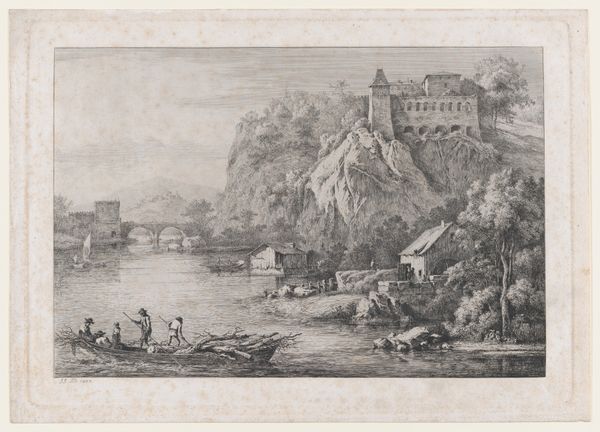 Curator: Here we have Rudolf Kuntz's "Burg auf einem Hügel an einem Fluss", or "Castle on a Hill by a River," created in 1842. It's rendered in pencil and ink, a technique common for the rapid creation of landscape studies. Editor: My first impression is quiet serenity. There’s something incredibly peaceful about the scene. A sense of nostalgia, maybe? It feels like stepping into a forgotten dream, almost sepia-toned even though it’s just pencil and ink. Curator: The sepia tone is understandable! The ink, often iron gall ink, naturally ages that way. The paper itself plays a role. It's not just a passive ground; its weave and absorbency affect how the ink bleeds and settles, a collaboration between maker and material. And we must consider Kuntz's location and patronage; were these quickly sold keepsakes, or commissioned studies for a more important painting? Editor: Good point about the collaborative process, Material informs the dream. The way the castle dominates the composition, though – perched high, overlooking the river traffic – it makes me wonder about power. Both its imposition and its inevitable decay as a function of material realities. It is like seeing a grand potential rendered so small on a sheet of paper. Almost vulnerable. Curator: Precisely. Romanticism was fascinated by ruins and the encroachment of nature upon the built environment. Note the detail in the vegetation versus the architecture: perhaps nature, always grinding materials down and returning to form, wins in the end. Then think about how Kuntz secured materials such as high-quality pencils during a period of rising industrialisation; how available, how portable? Editor: Yes, those contrasts of man and nature are compelling. The almost casual placement of figures along the shore and a lone fisherman only underlines how indifferent the world feels to any human presence. The overall impression is not just melancholic, it's about something passing—the ephemerality of ambition. Curator: Ambition embodied in both the imposing architecture and the act of producing art to outlive the maker. It reminds me that these scenes are produced by the economic landscape of 19th-century Frankfurt as much as the actual geographical ones, that both fed a demand and provided the infrastructure to bring them to us today in a condition fit for continued study. Editor: I am taken again by its seeming simplicity, while understanding the layers of thought and manufacture woven into the fibres of that very paper. An artefact in conversation with both its physical landscape and historical landscape—an artwork that still whispers questions more than delivers answers.