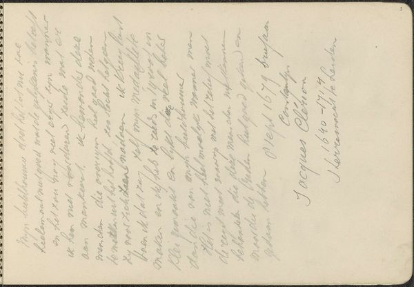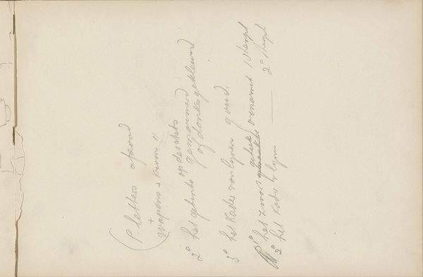 Carel Adolph Lion Cachet made this fragment from Andries Pels’ ‘Gebruik en misbruik des Toneels’ uit 1681. The off-white page, filled with cursive handwriting, immediately draws us into a space of intimate reflection, almost as if we're deciphering a personal diary. The script, rendered in delicate, almost ethereal strokes, creates a visual rhythm across the page, hinting at layers of meaning beyond the immediately legible. The act of handwriting itself becomes a focal point, a semiotic code that speaks to the passage of time. It suggests a moment of contemplation, echoing the themes within the original text by Andries Pels on the use and abuse of theatre. Cachet seems to be engaging with the historical and intellectual context of Pels' work, using the formal qualities of script and page to challenge fixed meanings. The visible texture of the page, combined with the cursive script, turns this fragment into an ongoing dialogue between past and present.