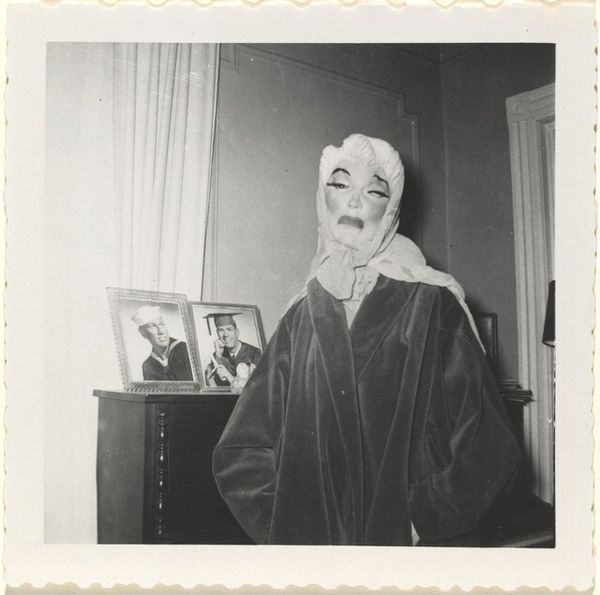 Curator: Here we have an intriguing gelatin-silver print, tentatively dated to the 1930s, its author listed as anonymous, known as "Untitled (Woman with face blacked out)." Editor: Well, it certainly makes an impression. The…void where her face should be is immediately unsettling, yet draws my eye. There's a stillness, despite the odd alteration. Curator: Indeed. What I find compelling is the overt act of image manipulation. The defacement, so to speak, brings forth questions about who altered it, and why. Was it a deliberate artistic gesture, a political act of censorship, or even a personal act of frustration? The possibilities are many. Editor: I'm focusing on the materiality itself – a gelatin-silver print indicates mass production, widespread circulation of imagery, and then *this*... This violent, dark interruption of that process. It shifts it from mere documentation into something confrontational. Look at her clothes, that long coat, the careful way she's holding her gloves, she embodies middle-class respectability, contrasted against such visual anarchy! Curator: It evokes elements of the Ashcan School aesthetic— a slice of ordinary urban life disrupted. One has to consider what this photograph meant within its original social milieu. Perhaps it touched on hidden societal anxieties, or offered subtle critique on societal norms and expectation for women. Editor: Or was there an issue of control, appropriation? Who held power over image-making, image owning? Even her dress becomes fascinating in itself. It hints at how fashion trends become standardised and manufactured on such a scale to fit every women. How many "ordinary" people did mass media start portraying at this time, I wonder... Curator: So much is suggested and so little concretely answered. It leaves us in the space of speculative interpretations about gender, class and maybe loss of individual identities, viewed through the dark lens of altered images that the establishment wants. Editor: It makes me look beyond the image, toward all those implicated in the process of taking, developing, and, yes, altering the original photograph. And reminds me what can be achieved even when taking pictures in times of crisis. It may give birth to whole new subcultures as the picture ages. Curator: Precisely! A disquieting and remarkably potent intervention on a traditional medium—an enduring statement, if you ask me, despite all its unknown context. Editor: A stark reminder of how our everyday encounters, and even photographs, become charged objects by their very process of production and those very human hands which alter them.