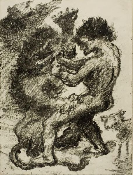 Editor: This drawing, "David rears an altar on the threshingfloor of Araunah the Jebusite" by Lovis Corinth, feels both urgent and ancient. The marks are so immediate, yet the subject is biblical. What strikes you most about it? Curator: It's like a memory surfacing, isn't it? Corinth's scratchy lines pull us into the raw emotion of the scene. Do you see the angel looming above? The charcoal seems to vibrate with divine power, or perhaps, divine anger. It reminds me of how our own guilt can haunt us, taking on monumental forms. Editor: So it's less about literal depiction and more about conveying a feeling? Curator: Exactly! Corinth isn't just illustrating a story; he's exploring the weight of repentance, the burden of leadership, and the sheer, terrifying presence of the sacred. It makes me wonder, what altars are we building today, and what are we hoping to atone for? Editor: That's a powerful thought. I'll definitely see this drawing differently now. Thanks!
