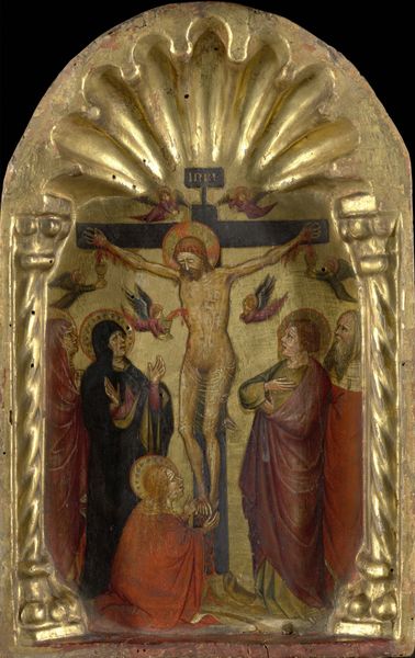 Curator: Cennino Cennini's "Madonna and Child with Angels and Saints," created around 1400 using tempera, presents a compelling study in the evolution of early-Renaissance artistry. The scene, brimming with celestial and holy figures, invites reflection. What’s your initial impression? Editor: Visually, it feels remarkably serene. The composition, particularly the arrangement of figures around the Madonna and Child, creates a sense of enclosure and protected space, a warm, unified plane, in spite of its clear layering. Curator: Yes, notice how the artist uses gold leaf. It is applied not only as a background, signifying divinity, but also meticulously within the fabric patterns, thus enriching the texture of the painting’s surface. Considering the patron, how might this type of ostentation served social or religious needs? Editor: Undoubtedly, the abundant use of gold broadcasts wealth and status. Beyond mere display, its employment underscored the importance of religious institutions in late medieval society, a clear assertion of spiritual authority. Curator: Let's observe the Madonna's face. There’s a marked sense of melancholy. Note that in contrast, the other figures lack dynamic individuality, which subtly concentrates the viewer's attention on the central figures of the Madonna and Child. Editor: Indeed. This stylistic choice seems intentional, aimed at highlighting the role of Mother and Child within contemporary Christian religious imagination. It’s a tableau not just of faith, but one imbued with social values. How were works such as these typically commissioned and distributed? Curator: Paintings such as these were typically commissioned by wealthy families or religious confraternities for private devotion or to adorn chapels. This panel's size suggests it may have functioned as a portable altarpiece. Editor: So it brings questions to its cultural functions, how religious pieces permeated society at the time... This conversation makes me appreciate not only the technical aspects but its intersection with broader cultural values of its historical time. Curator: Exactly, delving into the painting, what seemed at first glance like just a scene of adoration evolves into a deeper examination of its era’s religious sentiments and material sensibilities.