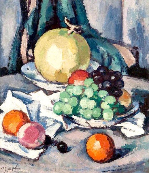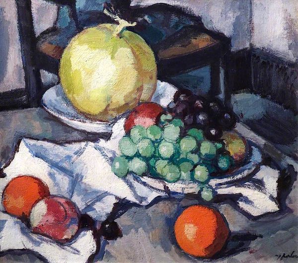Editor: Let's delve into Samuel Peploe's "Still Life with Jug, Melon, Grapes and Apples" from 1927, rendered in oil paint. It's quite a striking piece! The blues and greens create this somewhat melancholic mood. How would you interpret this painting within the artistic and cultural landscape of the time? Curator: Peploe’s still life, painted during the interwar period, resonates with the socio-cultural yearning for stability amidst rapid changes. Consider the still life genre itself; it's been a stage for demonstrating painterly skill, but also subtly reflects the values and tastes of the bourgeoisie. Doesn't the careful arrangement of fruit and the presence of the jug evoke a sense of domestic order and controlled abundance, perhaps a deliberate contrast to the uncertainties outside the home? How might its modernist style play into that? Editor: I hadn’t thought about it as a reaction to instability! It feels almost intentionally simplified, the shapes and colors so bold. Maybe it was a way of grounding himself in something tangible? Curator: Precisely! Furthermore, examine the role of galleries like Aitken Dott in Edinburgh. These commercial spaces, while platforms for artistic expression, were also carefully curating public taste. How do you think that might influence the types of works artists created and that we celebrate today? What would you say that the selection of fruit suggests, knowing the influence of galleries? Editor: Interesting. The galleries could have encouraged artists like Peploe to depict objects appealing to a specific clientele, ones signaling prosperity, perhaps. It makes me reconsider the artist's intent behind this still life. I guess the composition wasn't accidental! Curator: Indeed! We move from appreciation to something more nuanced. Considering art's public role adds dimensions beyond aesthetics. I feel I've learned how deeply economics play into art appreciation! Editor: Absolutely. It’s fascinating to consider art as a mirror of, and also as being affected by, the society it exists within.