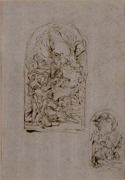 Editor: This drawing from around 1600 by Filippo Bellini, titled "Two panels for a wall decoration," uses pen and charcoal on paper. It seems to depict religious figures, and I’m struck by how unfinished it feels, like we’re catching a glimpse of the artistic process. What story do you think it tells, or perhaps, what role did drawings like these play in the art world of the time? Curator: That’s an insightful observation! The unfinished quality is key. Consider the socio-political and institutional context. Drawings like these often served as preparatory studies, not intended for public display. They were vital tools within the artist's workshop. Given the religious themes, we see a continuation of the Church being the great patron of the arts. The choice of Simon the Apostle is interesting given that his image isn't commonly commissioned - Why might this be? Editor: Hmm, maybe it’s just what the patron asked for, or perhaps it ties to a specific local legend or tradition they valued? Curator: Precisely! Think about the networks of power and patronage at play. The commission wasn't simply about artistic expression. It was a transaction embedded within specific social, religious, and even familial networks. It is a means to elevate individuals through the building and public display of lavish works of art that they paid for. The style suggests Mannerism – an elite and intellectual artistic style which also would have signaled wealth and knowledge on the commissioner’s part. Editor: So, viewing this through a historical lens, we see more than just religious figures; we see the machinery of artistic production, and its relationship to political and religious structures. Curator: Exactly! It reveals the intricate relationship between the artist, the patron, and the intended audience, highlighting how art served as a tool for social, religious, and political messaging. Editor: I’ve never thought about the public role of art in such detail, but looking at it now it seems almost impossible to separate the two. I’m thankful for your explanations. Curator: My pleasure, I'm very glad that I could illuminate this work with a different light for you, it has been a worthwhile conversation for us both.