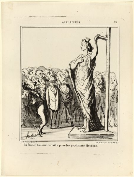 Editor: So, this lithograph on paper is titled "Run-Off Elections," or "Will she invite me for a second waltz?" by Honoré Daumier, dating back to 1869. There's a satirical quality, with these figures awaiting attention from "France." What are your initial thoughts on this piece? Curator: The magic of Daumier lies in how he utilized relatively inexpensive materials – lithographic crayon, paper, and the printing press – to mass-produce social commentary. He targeted a burgeoning middle class, eager for accessible political critiques. Look at the deliberate mark-making; those heavy lines conveying weariness, even decay, amongst the politicians. How does that production relate to the message itself? Editor: It's interesting that you mention the middle class, and the weariness does come through. Were prints a popular way to circulate opinions at the time, like social media today? Curator: Absolutely. Prints, particularly in newspapers and journals, were a vital mode of communication. Daumier’s caricatures weren’t just about artistic skill; they were about engaging with pressing social and political issues. The materiality – the accessibility of the medium – amplified his reach. Think about the economics of it; mass production allowing for wider dissemination of his criticisms. It is also a play with who is left out. Who were Daumier’s consumer base, and how might his political and social critique have shaped that market’s sense of self? Editor: So the means of production became an intrinsic part of the artwork's message. It democratized art in a way. Curator: Precisely. It blurred the lines between high art and popular culture. It was reproducible, disposable even, and inherently engaged with the mechanisms of power it sought to critique. It makes you consider how artworks function within economies of labor, material, and consumption. What do you think? Editor: That makes a lot of sense, seeing it now as part of a much bigger production process, influencing opinion at a specific time. Thanks for explaining that. Curator: My pleasure. Hopefully that illuminates new avenues for analyzing artistic intention and output in its era.