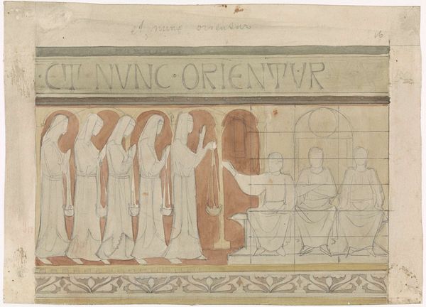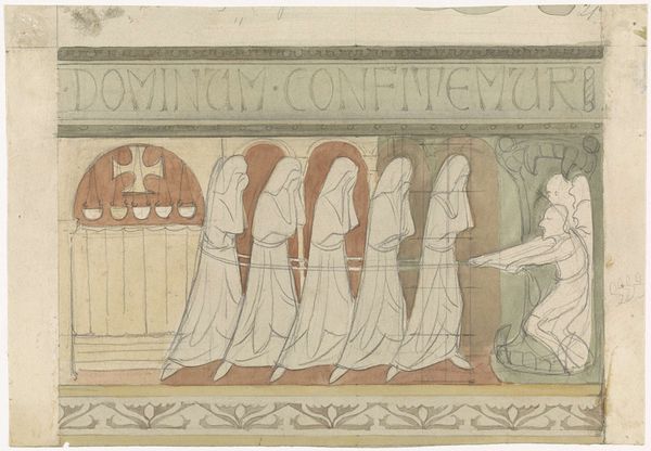 Antoon Derkinderen created this design for the Second Bossche Wall, using pencil and watercolor. Immediately striking is the artwork's muted palette and the solemn figures arranged symmetrically across the frame. The repetitive architectural arches create a rhythm, anchoring each saint within their space, yet united as a single plane. This work reveals Derkinderen's engagement with symbolism, evident in the precise arrangement of figures and their symbolic attributes. The linear precision and flattened perspective recall medieval tapestries and stained glass, reflecting a desire to return to a pre-industrial spiritual authenticity. Derkinderen employs a semiotic language, where each figure—through costume, gesture, and accompanying icon—communicates layers of meaning about sanctity, power, and historical identity. Consider the subtle variations in color that differentiate each figure. This design isn't simply an aesthetic exercise; it’s an exploration of the symbolic function of art, using visual language to create meaning.
