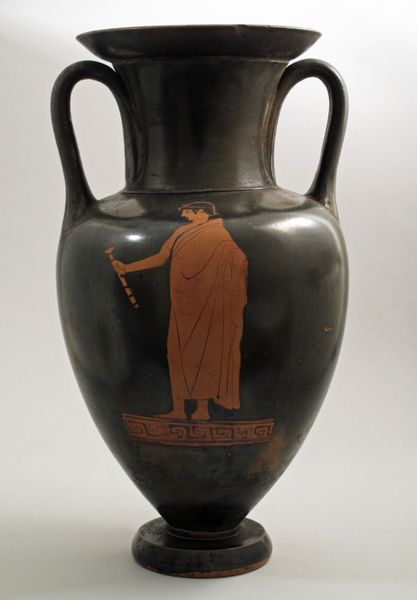 Editor: This is a neck amphora from the Medea Group, a storage vessel depicting Dionysos with maenads and satyrs. The craftsmanship is evident in the vase's shape and painted figures. What can you tell me about the materiality and social context of this piece? Curator: We see here a fascinating intersection of labor and ritual. Consider the potter's expertise in shaping the clay, transforming raw material into a functional object, and the painter's skill in depicting scenes of Bacchic revelry. How might the consumption of wine, stored within, have related to the social function of these images? Editor: That's a great point! I never thought about the link between the vessel's purpose and the imagery. Curator: Exactly. This piece challenges the separation of art from everyday life, highlighting the value and cultural significance embedded in material production and consumption. Editor: I’m seeing this in a completely different light now! Thanks for the insight. Curator: My pleasure. It's about seeing art as a product of social forces.