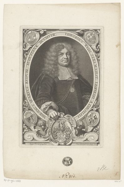 Curator: Here we have Jacob Houbraken’s "Portret van Karel de Moor," an engraving from 1751, housed here at the Rijksmuseum. Editor: It’s striking! The subject’s gaze is really intense and the amount of detail Houbraken achieves with just engraving is astounding. I’m immediately drawn to the contrast between the ornate oval frame and the tools of the trade. Curator: It's fascinating how Houbraken represents artistic identity here. De Moor is not merely depicted; he is presented within the context of his craft and societal standing. Note the subtle suggestion of his workspace beneath, and the small artworks scattered on the table at the lower right. The man is also shown to be holding his medal as the knight of the Holy Roman Empire Editor: Right, the materiality of the printmaking process is really apparent. The deliberate choice of engraving emphasizes the craft, the labour involved in producing an image intended for wider distribution, not only because this man, de Moor, made art; this print declares itself as art, too. Curator: Absolutely. Consider also how the inclusion of de Moor's tools – the palette and brushes – speaks to the tangible labor behind artistic creation, challenging the romanticized image of the artist as purely divinely inspired. Furthermore, how might the choice of printmaking as a medium impact the dissemination and perception of de Moor’s image, given the wider reach it afforded in the 18th century? How did that inform De Moor’s authority, if he had such intentions? Editor: And don't forget the role paper played. It's the silent carrier of this artistic identity. The cheap, readily available kind allowed this to be distributed more readily than oil paint. Curator: A crucial point! It underscores the accessibility of the image to a wider audience. Considering the engraving within the framework of Baroque portraiture, it's clear that Houbraken consciously situates de Moor within a lineage of celebrated figures. What does it convey to depict not a royal or nobleman, but an artist? Editor: Ultimately, Houbraken gives us not just a likeness, but also offers an understanding of art production in the 1700s by the skilled artisan's work in metal to mass-produce the art. Curator: Indeed, we have a carefully constructed presentation of artistic identity. It invites us to critically examine how the social, material, and representational dimensions intersect. Editor: Precisely. The tools of creation, immortalized in the copy by a very different tool! It all builds an experience that brings both of these artisan's world to us!