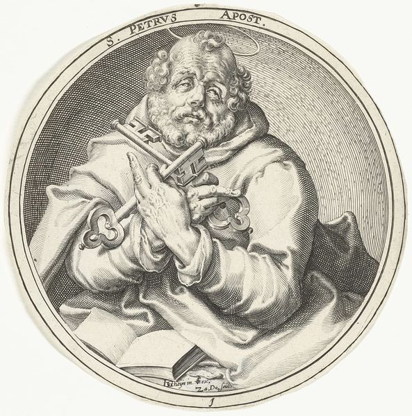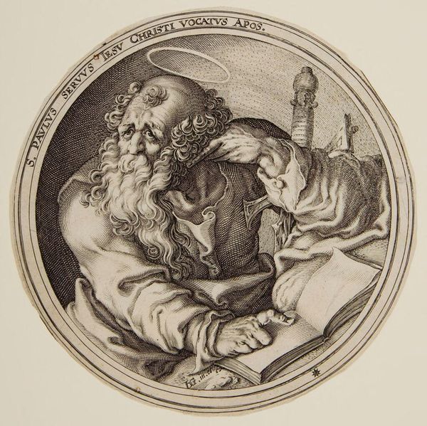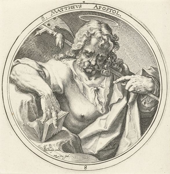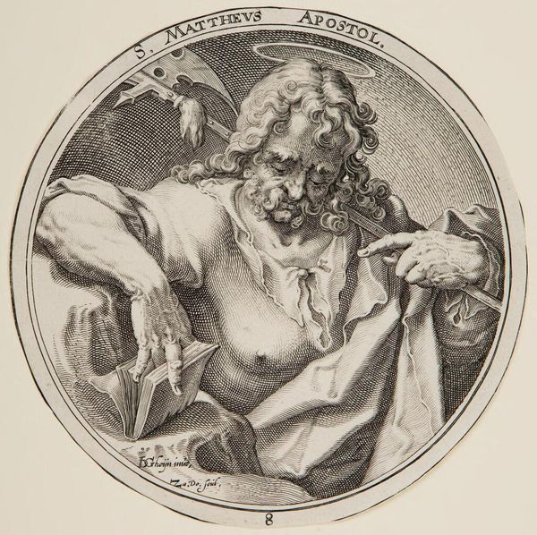 Editor: Here we have Zacharias Dolendo’s "Saint Bartholomew," a small print from the late 16th century, currently residing at the Harvard Art Museums. He looks so contemplative. What can you tell me about the symbolism here? Curator: Notice how Bartholomew holds both a book and what appears to be a flaying knife? The book signifies his scholarship and evangelism. The knife, however, is a potent symbol of his martyrdom, flayed alive for his faith. Editor: So, these aren't just objects; they're visual representations of his life and death. Curator: Precisely. Dolendo uses these objects to compress Bartholomew’s story into a single, powerful image, evoking centuries of veneration and cultural memory. Editor: It's fascinating how much meaning is packed into such a small space! I will never look at an image of Bartholomew the same way again.