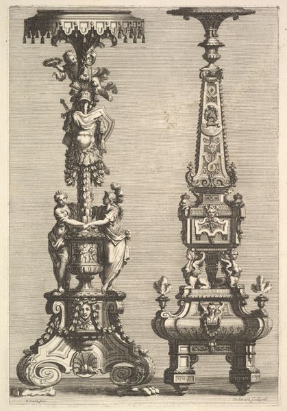 Daniel Hopfer created this print, "Two Candelabras," sometime between the late 15th and early 16th centuries. The stark contrast between the delicate lines of the etching and the elaborate forms of the candelabras immediately draws the eye. Hopfer’s work showcases the period's fascination with ornamentation and classical forms, evident in the grotesque figures and ornate details. Through his mastery of line, Hopfer transforms simple household objects into elaborate displays of power and status. The symmetry in their structure, yet asymmetry in their details, points towards a broader commentary on the Renaissance era. Ultimately, the print is a testament to the power of design and the symbolic weight of everyday objects. It suggests how material culture can reflect and shape prevailing social and philosophical ideals.