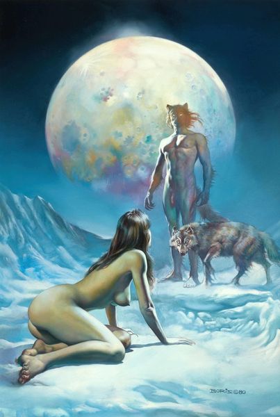 Editor: Here we have Boris Vallejo's "Reaching for the Stars," an acrylic painting from 1978. The figures feel so grounded and yet they’re floating in this immense space. It's quite dreamlike. How would you interpret this work, considering the historical context? Curator: The 1970s saw a surge in fantasy art, often acting as an escape from social and political anxieties. The genre also experienced commercialization through pulp magazines and book covers, making art accessible outside traditional galleries. What statement do you think Vallejo makes by placing these idealized figures within this market and socio-political situation? Editor: Perhaps, by showing idealized, attractive nudes he’s directly trying to appeal to that popular magazine market? Curator: Exactly! And by overtly engaging in such erotic-fantasy, he normalizes the human form within technological progress; which seems rather provocative. What message does the artist convey, reflecting on the time? Is this depiction celebratory, or does it introduce a critical perspective on humanity's direction and relationship with technological progress? Editor: It does feel like a commentary. There's a vulnerability in their nudity amidst such a cold, vast setting. They seem to be searching, perhaps even questioning their place in that vast cosmos. Curator: It pushes us to analyze what fantasy imagery meant in the late 70s and what these nude images meant when representing human beings exploring technology. It raises a critical lens on the social, political and technological landscape of its time and the impact it had on culture. Editor: This painting is more than just skin deep! It's made me consider the interaction between the art world and wider societal anxieties. Curator: Indeed. And understanding that interplay unlocks a richer appreciation for works like this, showing how they shaped—and were shaped by—their era.