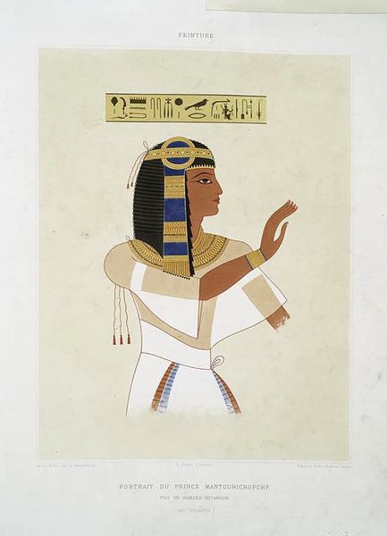 Charles K. Wilkinson made this color facsimile of Queen Nefertari being led by Isis sometime in the 20th century. Wilkinson's delicate rendering invites us to consider the roles of women in ancient Egyptian society, both divine and mortal. Nefertari, Great Royal Wife of Pharaoh Ramesses II, is depicted with the goddess Isis, a powerful figure associated with protection, magic, and motherhood. The intimate gesture of Isis leading Nefertari underscores a sense of shared femininity and mutual respect. The elaborate costumes and jewelry denote their high status, but also speak to deeply held spiritual beliefs about the afterlife. The original tomb painting would have been a vibrant declaration of power, spirituality, and the enduring legacy of women. Wilkinson's careful copy allows us to reflect on the intertwined threads of gender, divinity, and remembrance.