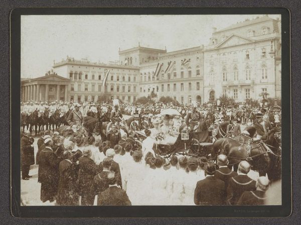Editor: This is "The Corpus Christi Procession Leaving The Church Of Santa Maria Del Mar," painted by Ramón Casas between 1896 and 1898. The crowd scene feels so immediate, but also, the individuals are kind of lost within the broader spectacle of the procession. What stands out to you about this piece? Curator: For me, it's the layering of labor, both visible and invisible. We see the direct labor in the crafting of the procession itself—the banners, the costumes, the construction of that visual spectacle. But consider the invisible labor as well—the social structures and hierarchies that dictate who participates and in what capacity. The balconies with their colorful fabrics highlight class division as well, and those are material creations that cost resources and human effort to build and put in place. Editor: That’s a great point. I was just focused on the artistic impression of the crowd, but you are directing my attention to the socioeconomic stratification evidenced in the piece. The division is really interesting. It’s almost as if the labor on the street performs for the viewing pleasure of a more affluent audience looking on. Curator: Exactly. And this Impressionistic style itself, with its quick brushstrokes and capture of fleeting moments, can be seen as a product of its time—a rapidly industrializing society. What materials are consumed, how space is utilized, and who does it all impact? That’s what the materiality reveals here. It gives form to this snapshot of turn-of-the-century Barcelona. Editor: I never really thought about Impressionism that way, as connected to the materials of urban life. It's cool how the scene depicted and the *way* it's depicted, both speak to social structure. Curator: Indeed. Looking closely at the labor and materials of art – what it’s *made* of, both literally and figuratively– reveals its profound engagement with its time.