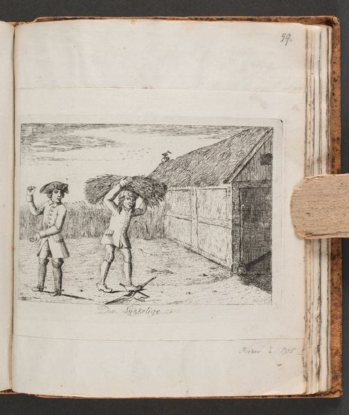 Curator: I see panic and awkwardness distilled into ink on paper. It’s strangely compelling. Editor: We're looking at "Ulykkelige hændelser nr. 6" or "Unhappy Events No. 6," an etching, engraving, and drawing by Georg Christian Schule, created around 1787. The artwork resides at the SMK, the National Gallery of Denmark. I find Schule's satirical rendering here very evocative. What's catching your eye? Curator: The theatrical quality is strong. It's like a snapshot from a badly directed play, the figures caught mid-escape, one on a ridiculously small horse, the other nearly colliding with that classical doorway. I immediately interpret this piece through a queer lens. It whispers of repressed desire and anxieties around masculine performance, no? Editor: Absolutely, considering the societal structures in late 18th-century Europe. Schule’s use of caricature here seems very pointed. This wasn't just idle jesting, but a visual commentary. Consider how power dynamics were reflected and reinforced. Curator: The setting is curious—part idyllic countryside, part imposing architecture. It's a world where social expectations literally box you in. And the fleeing figure seems eager to uphold that status quo, doesn't he? Even at the expense of looking utterly absurd. It is hard to deny its queer undercurrents: this piece becomes especially intriguing if one reads it through a lens informed by critical race theory, thinking of visibility as a social construct. Editor: Or perhaps Schule seeks to depict not merely physical escape, but escape from a system designed for repression. The use of line work, particularly the frenzied etching in the background, only intensifies that emotional landscape. It becomes clear the piece may seek to use Romantic artistic tools and strategies, yet mockingly. The artist walks a thin line between two worlds. Curator: Thinking about it now, its lack of clean lines might have been to make the figures not easily defined as to reinforce their othered identities. I find myself pondering the potential interpretations even more deeply. Editor: Exactly. Schule is making us work, isn't he? And in that labor of interpretation, maybe we catch a glimpse of our own biases, too. Curator: A glimpse indeed. It appears this little etching has plenty to teach us about ourselves. Editor: Well said!