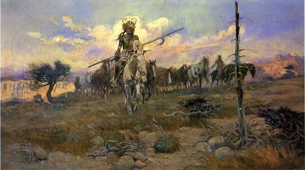 Charles M. Russell made this painting of a hunting party with oil on canvas. It feels like Russell laid down the tones first, like a wash, and then came back in to pick out the details, it’s a beautiful process. I love the way he captures the light, it’s almost like he’s painting with it. The colors are muted, warm, but there’s a sense of sadness in the scene, a kind of melancholic beauty. Look at that skull in the foreground, like a memento mori. The brushwork is loose and expressive, especially in the grass. It’s not about being precise, it’s about capturing the feeling of the place. It looks like he loaded up the brush and let it dance across the canvas. Russell reminds me of Homer, both of them painting these epic scenes of American life but with such a raw, human touch. They remind us that art isn’t just about what you see, it’s about how you feel, and that there’s always more than one way to tell a story.