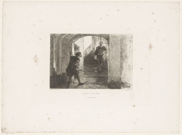 Adolphe Mouilleron created this print, "Overdekte straat met mensen in Algiers," using etching technique. It offers a glimpse into Algiers, but through a very specific lens, namely that of French colonialism. Mouilleron, as a French artist, was part of a broader cultural project that exoticized and, in many ways, misrepresented the realities of Algerian life. Notice the figures: their clothing, their postures. How might these details reflect the orientalist fantasies prevalent in European art of the time? The image is not just a neutral depiction; it's constructed, mediated by power dynamics, and imbued with the gaze of the colonizer. Consider the implications of viewing this work today. What does it mean to look back at such images, understanding their historical context and the asymmetrical power relations they embody? How do we grapple with the complexities of appreciating the artistry while remaining critical of its ideological underpinnings?