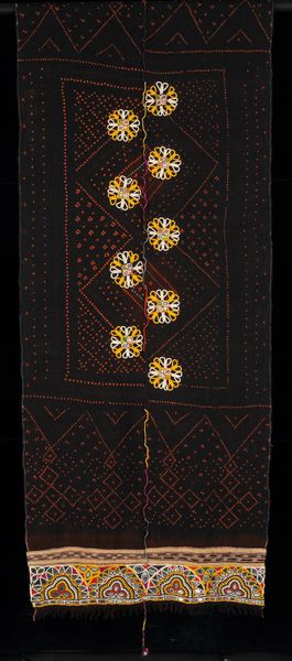 Curator: This is an "Elephant Mask" created around 1900 by the Bamileke people. You can find it here at the Minneapolis Institute of Art. Editor: It's visually striking, I must say. The rigid verticality combined with those radiating discs around the head create a fascinating tension. The beadwork itself seems incredibly meticulous. Curator: The geometric patterns are so important. Diamond shapes, for example, are laden with symbolic weight. They represent the leopard, a vital power symbol, so the mask embodies status and rulership. Editor: Indeed. The restricted palette – primarily white, red, and blue – underscores the inherent structure. Each bead functions almost like a pixel, collectively forming these symbolic arrangements. What a feat of organization and artistry! Curator: The long, flowing panels accentuate the dancer's movements during ceremonial performances, imbuing the masquerade with even greater spectacle. The visual language really is one of power and tradition. To wear this is to embody a significant role in Bamileke society. Editor: I am drawn to the interplay of tactile materiality with abstract form, though. There is a tension. Curator: In what way? Editor: It both compels the wearer’s persona and extends an implicit language of geometric symbols outward from the self, as performative gesture, and in doing so invites us to observe how it has become a material signifier and extension of culture. Curator: I find it fascinating how something can be so intimately tied to personal identity while simultaneously serving as a vessel for collective memory and shared values. Editor: It certainly challenges conventional definitions of portraiture, wouldn’t you say?