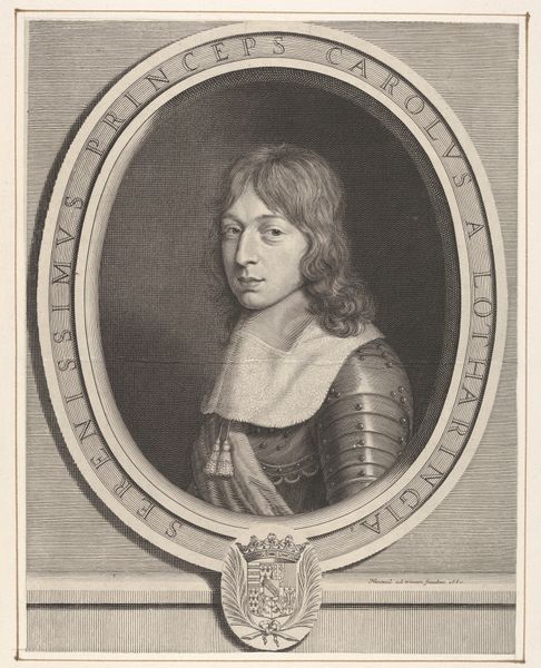 This is Robert Nanteuil's portrait of Philibert-Emmanuel de Beaumanoir de Lavardin, a print rendered in meticulous detail. The oval format immediately draws our focus to the subject, framed as if in a mirror reflecting the Bishop’s status. Nanteuil masterfully employs line and texture. Notice how fine hatching defines the contours of Lavardin’s face and vestments, creating a sense of depth and volume. The texture varies from the smooth, polished surface of the face to the intricate patterns of his robes. This contrast enlivens the composition, giving the image a tangible presence. The composition's structure operates through a system of signs, with each element carefully placed to communicate power and authority. The gaze, the clothing, the emblem—all converge to construct a visual language that speaks to the sitter’s identity and role within the social hierarchy. This portrait, therefore, functions not merely as a representation but as a carefully constructed statement about identity, power, and representation within 17th-century French society.
