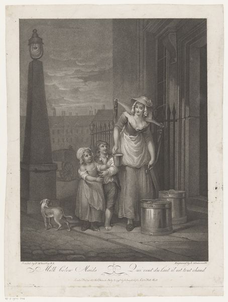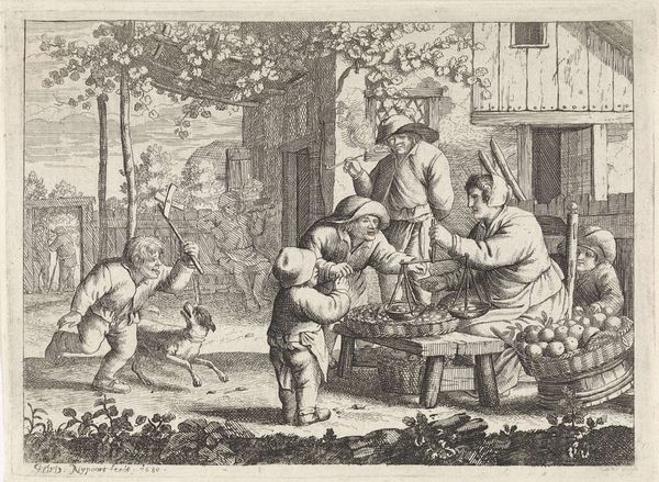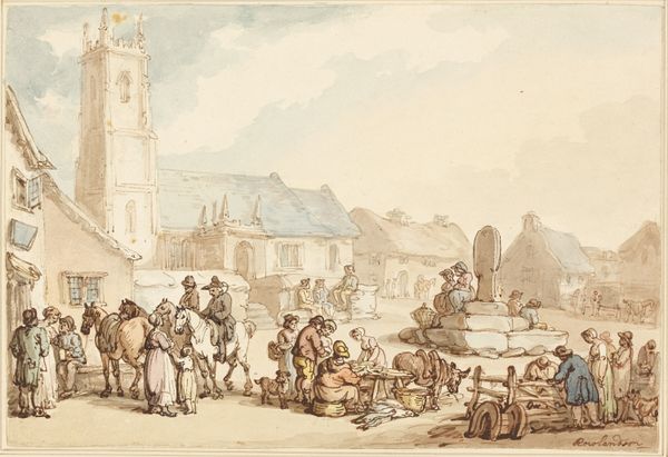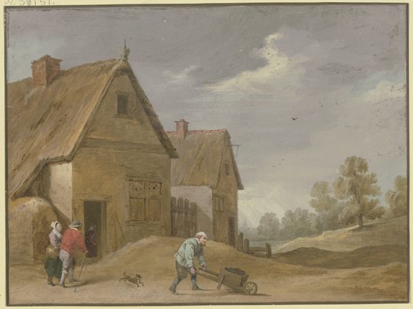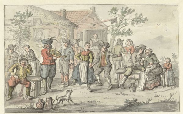 Editor: So, here we have Maria Margaretha la Fargue’s "Savoyardenknabe vor einem Hause tanzend" from 1772, created with pen, ink, watercolor, and coloured pencil. It feels almost like a snapshot of everyday life, but there's something a little melancholy about it too. What do you see in this piece? Curator: It's more than just a snapshot; it's a window into the societal structures of 18th-century Dutch life. Notice the Savoyard boy, likely an itinerant performer from a marginalized community. His presence performing for the upper-class women calls attention to the sharp divide between those who can enjoy leisurely pursuits and those forced to earn a meager living. How does the boy’s position contrast with the domestic interior of the house? Editor: Well, he’s outside, quite literally on the periphery. The women are inside a comfortable home and he is entertaining them in the courtyard. Curator: Exactly. And the almost clinical precision of the architecture contrasts with the fluid brushstrokes used for the landscape, doesn't it? This dichotomy underscores the social hierarchy where fixed structures of power and wealth observe and sometimes exploit those existing on its edges. Does this imbalance affect your emotional response to the artwork? Editor: I think so. There’s an innocence in the boy’s performance, almost naive, and it makes the dynamic feel a bit unsettling, almost exploitative. It feels like he’s performing *for* them. Curator: And the presence of the dog further highlights that dynamic of performer and audience, perhaps? These elements combined offer us insights into class, labour, and the economics of leisure, issues still relevant today. What will you take away from this discussion? Editor: I hadn't considered the social commentary so explicitly. It shows how art can capture not just a moment, but a complex web of societal relationships. Curator: Precisely, seeing beyond the surface is seeing the bigger picture, it is a powerful way of understanding the artwork and its importance beyond beauty and decoration.