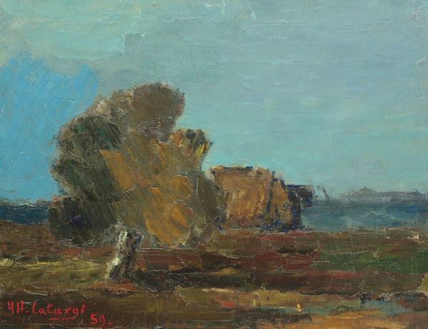 Editor: So, this is Denman Waldo Ross's "Highland Light, North Truro." It's a small oil painting, and it feels so... unfinished, almost aggressively so. What do you see in this piece? Curator: I see a rejection of academic painting, a conscious decision to embrace the raw and the immediate. Consider how Ross, as part of the Arts and Crafts movement, engaged with the politics of labor. Editor: Politics of labor? How does that relate to the haystacks? Curator: Think about the romanticized view of rural life versus the often brutal reality of farm work. Is Ross celebrating or critiquing this labor? His aesthetic choices certainly invite the question. Editor: I hadn't thought about it that way. It's less about the pretty colors and more about what they represent. Curator: Exactly! Art is not simply aesthetics; it’s a dialogue with society. Editor: I'll never look at a landscape the same way again.