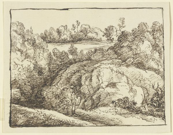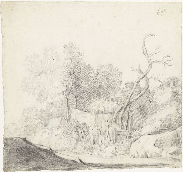 Curator: Alphonse Legros' etching, "Farm on a Hill," presents a landscape rendered with delicate lines. It is an evocative example of the realist tradition in printmaking. Editor: The first word that springs to mind is tranquility, an undeniable serenity—almost bucolic—washes over you as you gaze upon it. The lone figure with their laden donkey...there’s something beautifully mournful there, too. Curator: Legros, a professor at the Slade School, championed etching as a key art form accessible to a wider audience during a time when academic painting dominated the art world. Editor: It's true; this etching achieves that. But what makes it special is its use of humble lines, the way they almost tremble and coalesce to form trees and stone, sky and slope. How the eye just wanders across those delicate hatches! The bare minimum achieves… maximum impact. Curator: Absolutely, it's fascinating how the social status of artistic practices is often intrinsically linked to accessibility and perceived difficulty. Legros elevated everyday life, much like Millet, as a valid and important subject for artistic representation. Editor: It is such a refreshing counterpoint to some modern movements where shock value eclipses emotional depth. It feels… well, human. Vulnerable even, if art can be that. Curator: This piece invites reflection on the romanticism of rural life and its stark contrast to urban industrialization during the 19th century. Editor: It certainly captures that particular spirit of his time, and more so it holds its appeal as a reminder that beauty lies sometimes in the mundane, just on top of a hill, perhaps.