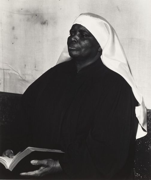 Editor: This is Lewis Hine's "Jewish Grandmother, Ellis Island." The high contrast and the woman's upward gaze give it a sense of hope. What do you see in this photograph? Curator: The formal elements are striking. Note the strategic use of light and shadow. Hine’s composition directs our eyes upward, but the textures present on the woman’s face are a stark reminder of the hardships. How does this interplay of light and texture affect your interpretation? Editor: It’s like the hope is tempered by reality. The smoothness of the scarf contrasts with the deeply lined face. Curator: Precisely. Hine masterfully uses contrast not just in tone, but in texture as well. Notice also the framing. How does the cropping affect the overall impact? Editor: It focuses us on the woman and her expression. It's quite powerful. Curator: Agreed. The composition amplifies the emotional weight of the subject, inviting a deeper engagement with the narrative of immigration. Editor: I see it now. Thanks for pointing out those details!