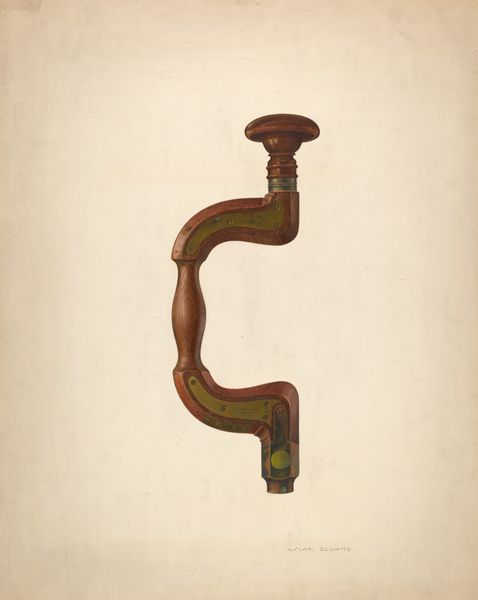 Curator: Here we have Samuel W. Ford’s "Apple Peeler," likely completed between 1935 and 1942. What strikes you first about this piece? Editor: It's the quiet stillness of it all. The subdued colors, the meticulous rendering... there's a real sense of focused observation, but without high drama. A certain humbleness? Curator: Yes, "humble" resonates. Ford worked for the Index of American Design, a WPA project documenting decorative and folk arts. These renderings served as historical records but also provided work for artists during the Depression. It underscores the value the government placed on preserving cultural memory, especially crafts tied to earlier American ingenuity and domestic life. Editor: Ingenuity is key. The object is quite striking – a rhythmic interplay of cylinders and right angles. The rendering also has a touch of abstraction with geometric volumes defined by the use of tone and color to suggest depth and roundness. Curator: The artist meticulously documented this fairly commonplace object. It reflects a time of transition, acknowledging simpler, pre-industrial means while the nation grappled with a changing economy and anxieties around technology. The choice of subject perhaps underscores the value of craft in a rapidly industrializing world. Editor: Absolutely. And from a purely visual perspective, I'm drawn to the artist's handling of light. The soft gradations give the wood texture an almost palpable quality, and the toned paper gives it a beautiful warmth. There is careful consideration and rendering of a singular moment captured by a fleeting light. Curator: This detailed focus elevates something ordinary, turning it into a portrait of a bygone era and its tools. Editor: Agreed. What seemed like a mundane illustration opens into so much more. The rendering highlights its intrinsic qualities in a time capsule effect. Curator: A subtle statement about the things we choose to remember and value. Editor: It truly captures both a specific object and a mood of quiet appreciation. Thank you for putting its cultural context into focus, really changing my reading of the artwork.