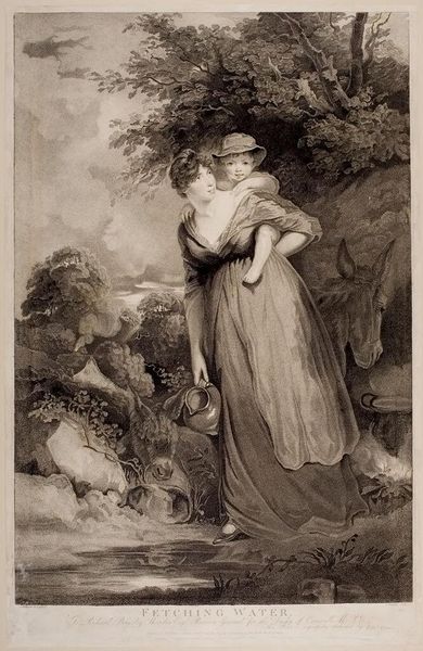 Francesco Bartolozzi created "Louisa Hammond schrijvend onder een boom" using etching. The artwork, in shades of brown, captures a woman seated beneath a tree, engrossed in writing. The oval composition, with its soft sepia tones, evokes a sense of nostalgia. Notice how Bartolozzi balances the figure's luminous dress against the dense, darker foliage, creating a contrast that draws our eyes to her contemplative pose. The overall structure subtly destabilizes conventional portraiture by embedding the sitter within a broader, more ambiguous natural context, suggesting a convergence of human intellect and natural processes. Consider the semiotic implications of the landscape: nature, in its verdant yet somewhat indistinct form, acts as a signifier of the romantic ideal, reflecting a broader cultural engagement with nature. Through his formal choices, Bartolozzi invites us to consider the interplay between the subject, her environment, and the act of artistic representation itself.