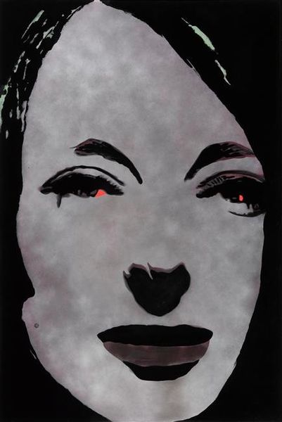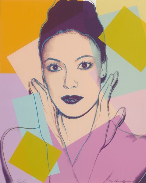 Curator: Here we have Andy Warhol's 1974 portrait of Hélène Rochas, rendered in acrylic on canvas. The flat planes of color immediately strike you, don't they? Editor: It’s interesting how the material simplicity, acrylic on canvas, still conveys such a… fragile impression. The woman almost seems to be dissolving into the pink background. Curator: That's quite fitting, actually. Rochas herself embodied an ideal of feminine elegance. Consider how Warhol, fascinated by celebrity and beauty, captures her. Pink, a colour long coded with femininity, is dominant. Her face seems almost shell-like. Editor: And the technique… the bold, almost careless strokes. You can almost feel the squeegee moving across the canvas. There is nothing delicate about the act of *making* it, which throws her refined elegance into an odd tension. Was it perhaps commissioned? The Rochas fashion and perfume house would certainly have been canny about branding. Curator: Very likely so. The portrait can be seen as a comment on the manufacturing of iconic personas, like the brand itself— Warhols artistic production line producing the images by proxy which challenges the unique handmade artistic vision. He uses this mass-production technique to capture a person that has a perfume and fashion empire created after her own likeness. The color choices carry psychological weight too. The green eyeshadow almost looks acidic and contrasts jarringly with the pink, lending a sense of unease beneath the surface. Editor: Right. The pink speaks of romanticism, perhaps… a faded glamour. But the slightly clashing greens undermine that entirely. One can only imagine the costs of producing something so very apparently *un*labored, which reveals so much about the Warholian attitude towards high/low class production methods of the day, a signifier that something supposedly "simple" costs so very much. Curator: Yes, exactly. And consider that for a moment: Rochas, the epitome of a created, refined identity, rendered through a process which, while mechanically produced, hints at underlying instability through these discordant colors. Editor: Ultimately, it reminds you that the material, even in its simulated “cheapness”, embodies that very tension in postwar consumer desire—the dream of affluence for all masking a deeper social rift. Curator: A dream spun from both paint and societal desires. Thank you for joining me for this look at Andy Warhol's "Hélène Rochas". Editor: A compelling artwork whose deceptively simplistic nature holds multitudes for modern eyes.