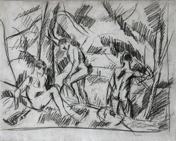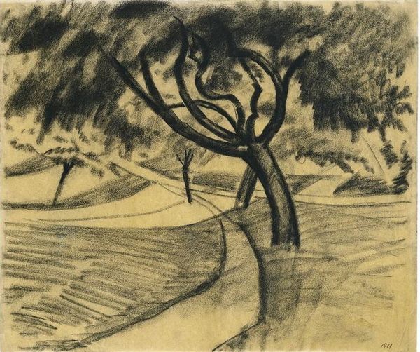 Curator: Welcome. We are looking at “Under the Fig”, painted by Othon Friesz in 1922. This oil on canvas is a landscape, currently held at the SMK, the National Gallery of Denmark. What are your first thoughts? Editor: There’s an unsettling intensity. It looks more like the artist's mindscape than a landscape. You feel the weight of the thick pigment he has manipulated and scraped across the canvas. How else do you see it? Curator: Well, consider the formal devices. Friesz is definitely exploring planes and forms, typical for an expressionist, to translate emotional experience. The twisted fig tree dominates, doesn’t it, almost suffocating the composition? See how it uses contrasting tonalities? Editor: The brushwork alone conveys something important about labor; there is visible physical engagement, a building-up and a breaking-down. It reminds us the artist toiled, physically engaging in the means of creating. It is rough, isn’t it, not pristine and removed. It begs the question—how do such heavy materials reveal social context and effort in representing this seemingly natural setting? Curator: Perhaps through a subjective filter; he breaks from purely mimetic representation, so we’re drawn to the internal and formal aspects of the scene more. This approach seems intentional. What impact does the light and dark tonality and almost aggressive brushstroke choices have on our reading? It is far from neutral. Editor: Those marks become material themselves! They shift from just “depicting” foliage to manifesting his exertion with tools and pigment. Does the roughness mimic the manual labor often excluded from the idyllic views such scenes conjure, contrasting bourgeois comfort with labor? Curator: An interesting consideration! The expressionistic aesthetic heightens the dramatic qualities while reflecting emotional or psychological responses rather than documenting objective facts. So in this image of this simple location, he does seem to want to create a certain expression for the viewer, who comes face to face with the emotional reality of landscape experience. Editor: Examining the materiality lets me look beyond subject to question social position and art-making process. It leaves me thinking how manual engagement shapes even “natural” scenes. Curator: While analyzing this scene under those terms you allow the aesthetic, as an articulation of its formal characteristics to convey what may have never been recorded. So thank you for sharing that lens through which to consider the composition!