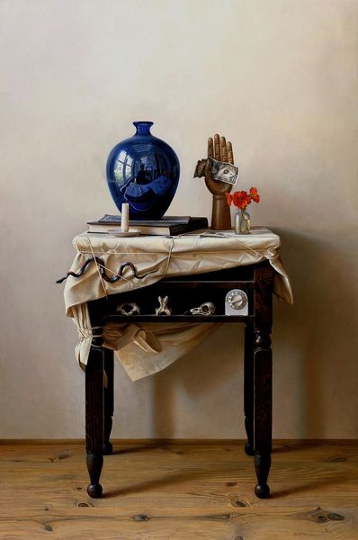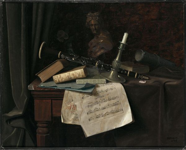Curator: Today we're looking at "My Gems," an oil painting crafted in 1888 by William Michael Harnett. Editor: Immediately, the intense stillness grabs me. There’s a gravity to this arrangement of objects; the muted color palette creates such a contemplative mood. Curator: Harnett was a master of trompe-l'oeil, essentially fooling the eye. Paintings like these gained popularity in the late 19th century, in part because of their accessibility; they were democratic images depicting everyday items that people readily recognized. These works were also particularly prized among the middle classes. Editor: Yes, these objects resonate, don’t they? The half-smoked pipe, the carefully placed music sheet… and note the title itself, "My Gems." It all conveys a sense of cherished memories and pastimes. Each item is so precisely rendered it feels intensely personal. Curator: And think about the implied social context. While the wealthy collected portraits and landscapes, Harnett’s still life gave those without access to those subjects the opportunity to engage with fine art that depicted elements from their everyday lives. The painting reflects the burgeoning middle class and its growing cultural influence. Editor: The lantern hovering above, nearly lost in the brown background, seems to function as a symbol of enlightenment through knowledge, surrounded by these scholarly items, these prized personal pleasures, as you say. It feels very carefully considered, from its positioning to the objects in the arrangement. Curator: In the American context, realism and naturalism also coincided with broader conversations about scientific observation and objectivity, ideas that were rapidly permeating other disciplines beyond art. Harnett engages with these intellectual concerns but ultimately, his meticulous renderings draw our eye towards those textures of domestic space. Editor: For me, it’s the feeling that time has slowed, like an interruption. We find someone’s table precisely as they’ve left it. We have stumbled upon a private world frozen in paint. It gives the still life new resonance for today, asking the viewer to pause and contemplate. Curator: Precisely, I feel it provides insights into both Harnett’s time, but also allows us to connect and feel our own connection to treasured possessions. Editor: I completely agree, reflecting on its accessibility, this really encapsulates Harnett’s enduring gift for capturing a poignant essence.