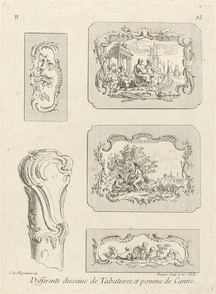 Here are six designs for watch cases by Gabriel Huquier, made with etching sometime between the late 17th and early 18th century. The organization of this piece is structured by a grid, each cell containing a circular design. This immediately suggests a systematized approach to art, reflecting Enlightenment ideals of order. Look closely at how each design plays with the tension between geometric form and organic motifs. The round shape is a constant, yet within it, there is a baroque exuberance. Figures, flora, and architectural elements blend together. This creates a miniature stage of intricate scenes, where precise line work defines depth. The prints function beyond mere decoration; they are a study in semiotics. Each scene can be decoded to reveal hidden meanings and cultural values, inviting us to consider the underlying structure and philosophical concepts that drive these artistic representations. The structure of these images invites repeated examination and continual reinterpretation.
