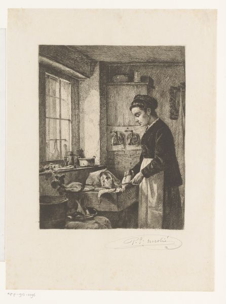 Paul Emile Nicolié created this understated drawing called 'Vrouw bereidt vis in een keuken' in 1876. The composition draws us into a quiet domestic scene dominated by the preparations for a meal. Nicolié's formal handling of the light is striking. He uses cross-hatching to create depth and shadow, bringing the texture of the brickwork to life, while the soft light from the window gently illuminates the woman, highlighting the simple dignity of her work. This quiet portrayal is a testament to the everyday, challenging traditional hierarchies that often placed more value on heroic or grand subjects. The structure of the drawing emphasizes balance and order. Nicolié invites us to reconsider our perception of value and beauty. The drawing prompts us to see worth in the mundane. It's a perspective that resonates even today, inviting ongoing interpretation and reflection.